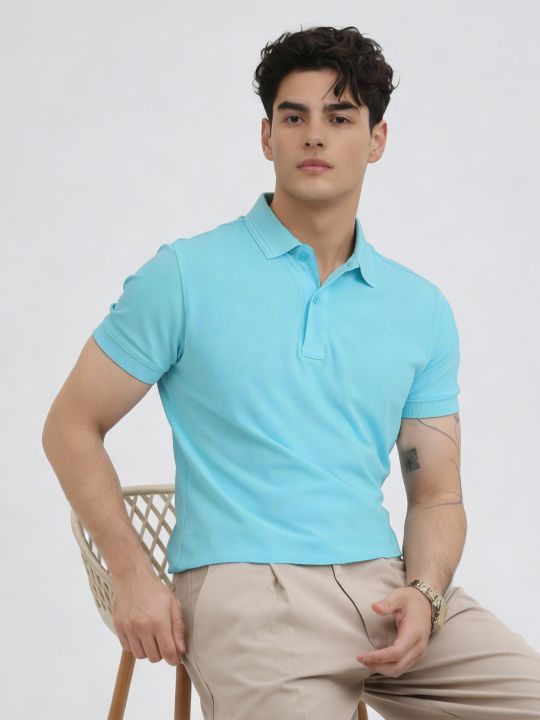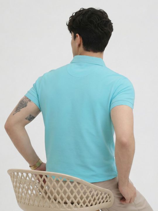 Basic Aqua Double Butt Collared Pique Polo T Shirt