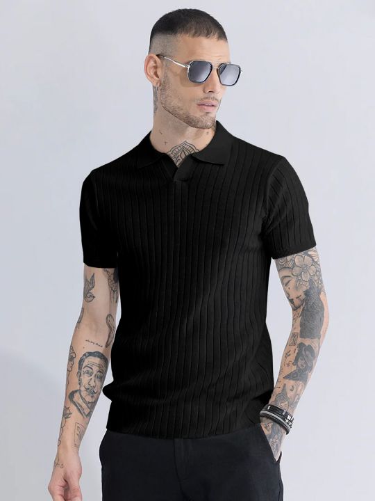 Black Knitted Polo T Shirt For Men