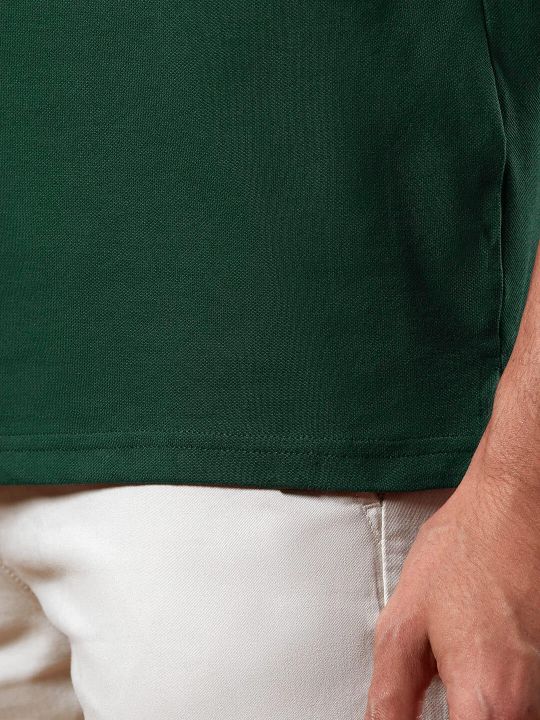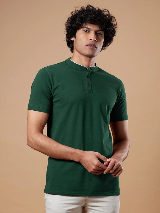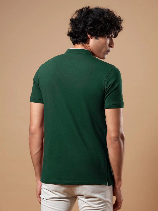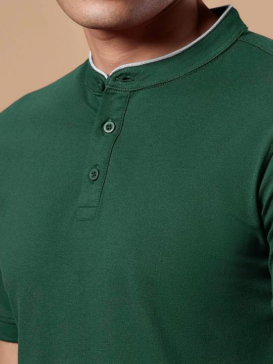 Mandarin Collar Bottle Green Pique Polo T Shirt
