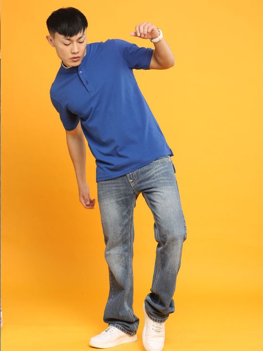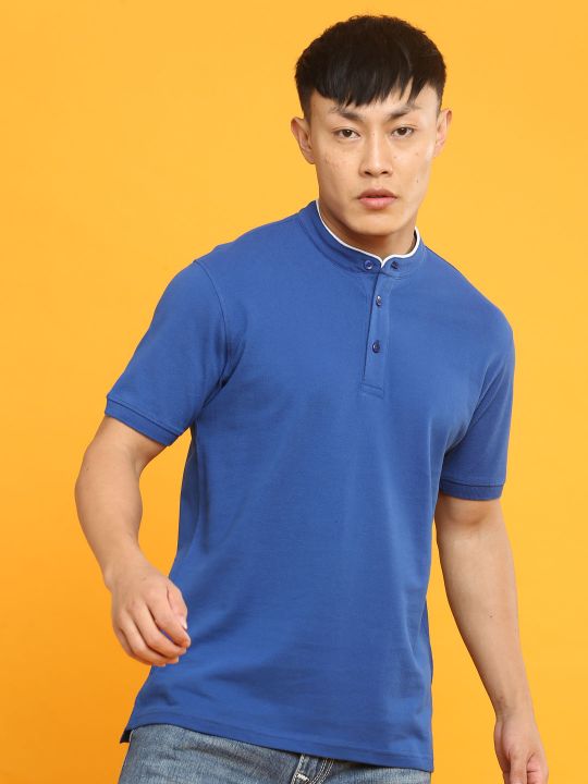 Mandarin Collar Royal Blue Pique Polo T Shirt